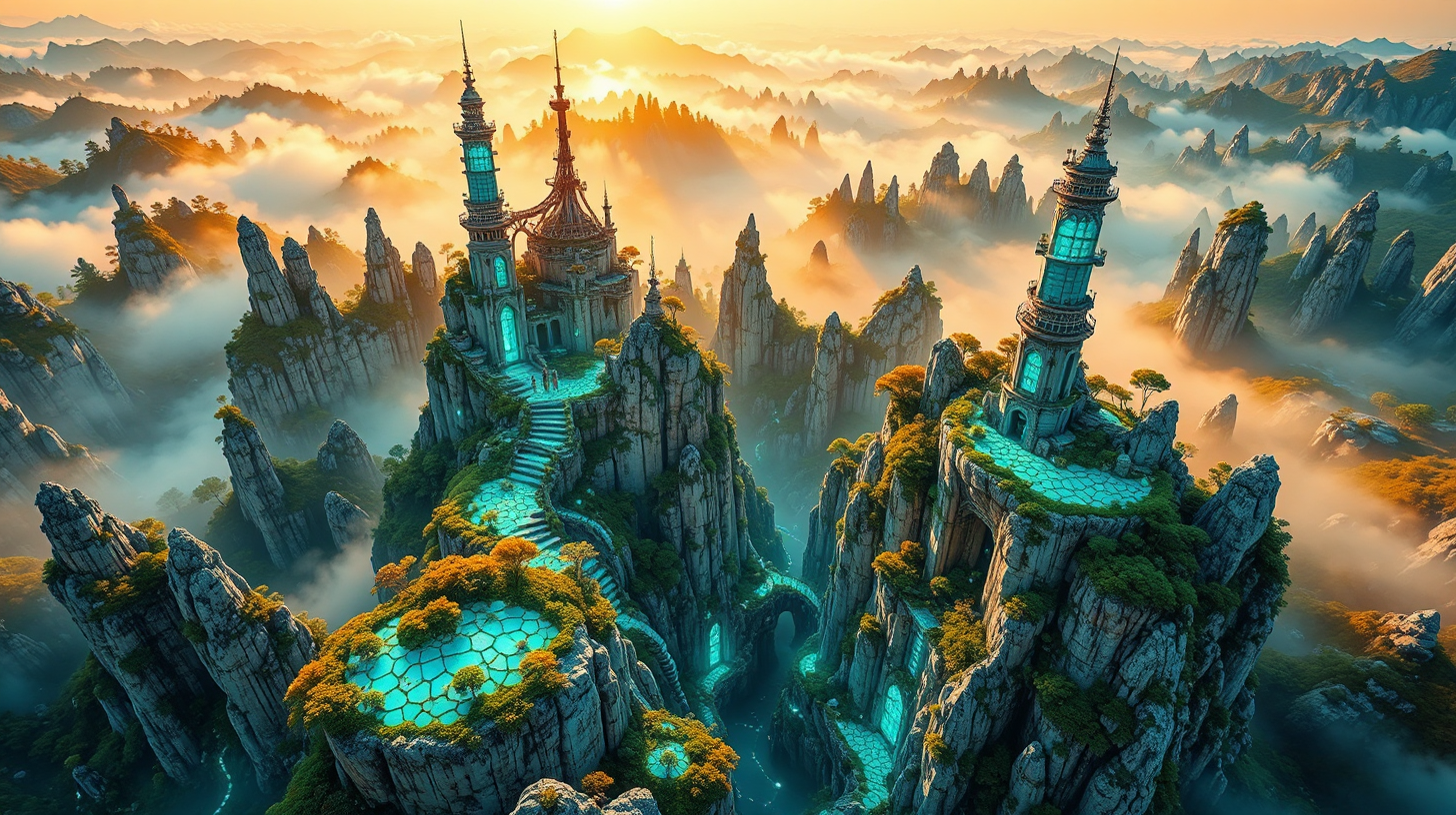 作图提示词:A breathtaking aerial view of a karst landscape at dawn, featuring elegant biotowers harmoniously blending with limestone formations, quantum moss radiating bioluminescent cyan and emerald patterns on rock surfaces, shimmering nanobot networks interwoven through geological strata, warm golden sunlight seeping through the morning mist, creating a vibrant turquoise and amber color palette that embodies an ethereal atmosphere of technological and natural symbiosis.