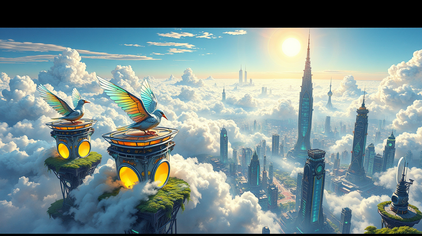 作图提示词:An aerial view of futuristic eco-towers in Qingyuan, featuring solar-powered mechanical birds resting on glowing energy cores. Sunlight refracts through their iridescent wings, creating vibrant reflections on cloud layers. An upward angle captures their dynamic takeoff alongside intricate holographic cityscapes, with bioluminescent quantum moss harmonizing with towering structures.