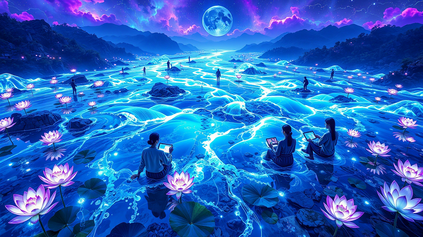 作图提示词:An ultrawide shot of a holographic Beijiang River, where photonic rapids interact with a crystalline water surface. The river reflects luminescent Miao ethnic jewelry holograms alongside programmers and artists collaborating via augmented reality interfaces. Their gestures skillfully manipulate glowing data streams that merge with the water currents, surrounded by neon-blue cybernetic lotus flowers blooming under violet nebula lighting.