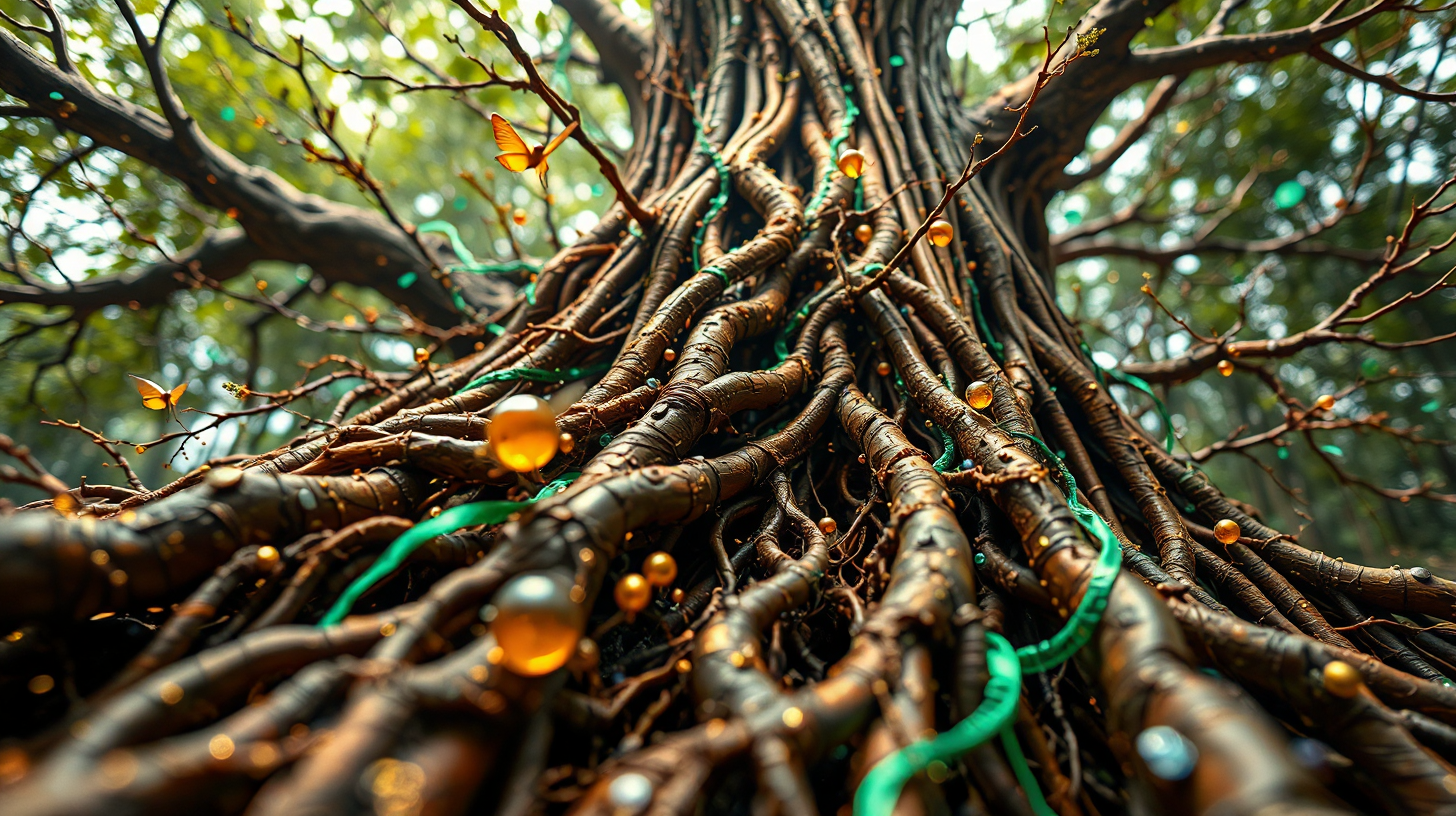 作图提示词:A detailed macro view of ancient tea tree roots intricately entwined with biocompatible data conduits, amber-hued nanobots gliding gracefully among the roots, with emerald streams of data flowing through the root system, captured from a low angle to reveal the organic and mechanical symbiotic structure, rich deep brown and gilded tones dominating the scene, while cultural memories manifest as holographic fragments within the intricate details.