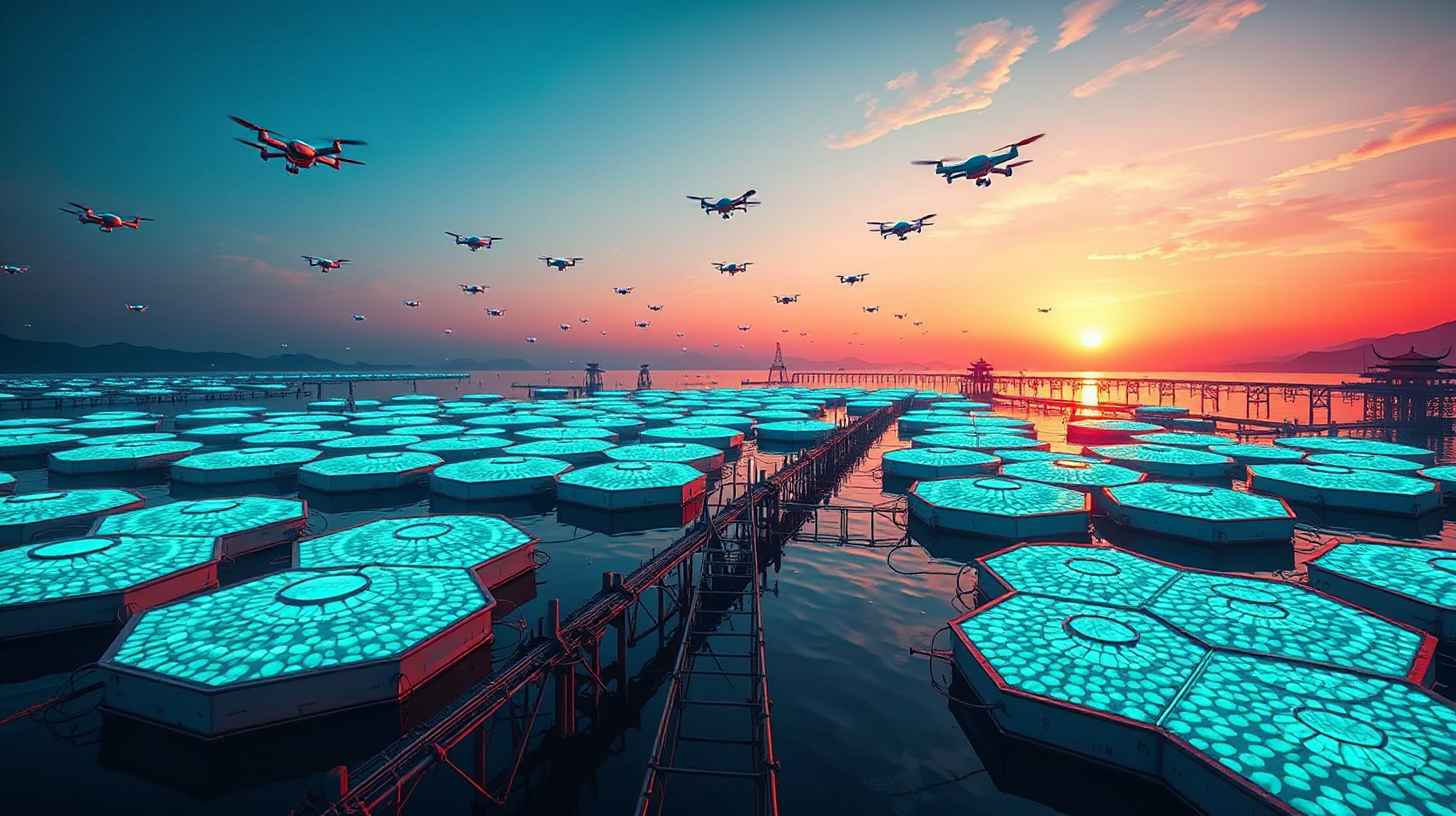 作图提示词:Ultrawide shot of Donghai intelligent aquaculture platform at twilight, with glowing hexagonal bioreactors filled with cyan algae, synchronized drones mimicking dynamic shoal patterns above the water, traditional fishing weirs seamlessly integrated with modern sensor networks, reflecting the crimson hues of the sunset on fractal-shaped aquaculture structures.