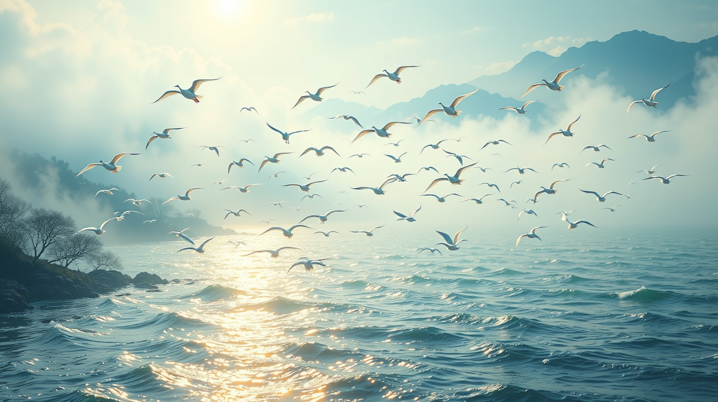 作图提示词:Aerial view of Wuyuan Bay on a winter solstice evening, with a flock of egrets gracefully flying above the shimmering waves reflecting golden light, set against a backdrop of ethereal mist, presenting a harmonious blend of nature and the season in an 8k resolution, showcasing rich cyan and silver hues.
