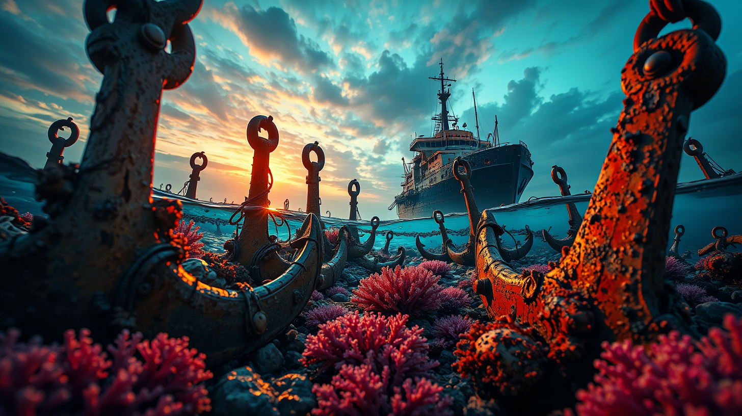 作图提示词:Low-angle shot of an abandoned shipyard at twilight with corroded anchors entwined in vibrant coral polyps, illuminated by warm amber light reflecting off the cool blue water, showcasing a cinematic composition that captures the beauty of decay and the rebirth of nature, with a soft focus effect enhancing the atmospheric quality.