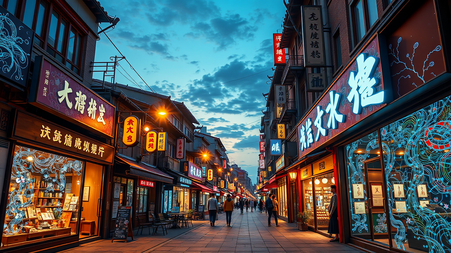 作图提示词:Side view of Zhongshan Road arcade at dawn, where augmented reality projections creatively transform shop signs into dynamic calligraphy, traditional lacquer threads artistically intertwined with digital data streams in storefront displays, warm streetlight glow contrasting with cool holographic projections, emphasizing the interplay between traditional crafts and modern technology.