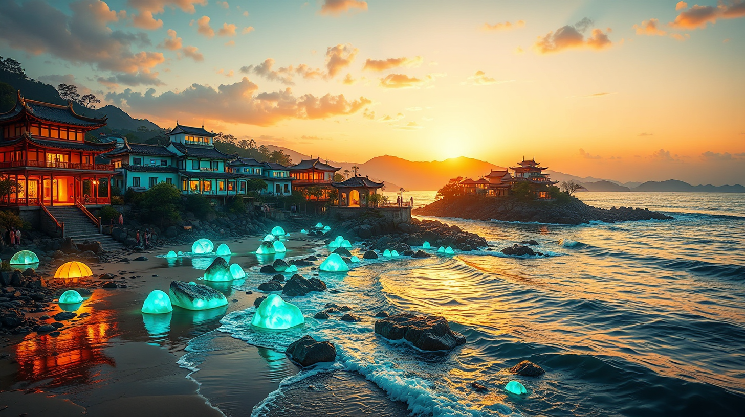 作图提示词:Aerial view of Gulangyu Island’s coastline at golden hour, featuring glowing bioluminescent tidal rocks, waves rhythmically lapping at the shore, traditional Minnan architecture harmoniously integrated with contemporary light installations, vibrant turquoise and amber hues reflecting on wet surfaces, capturing the surreal fusion of music and ocean energy.