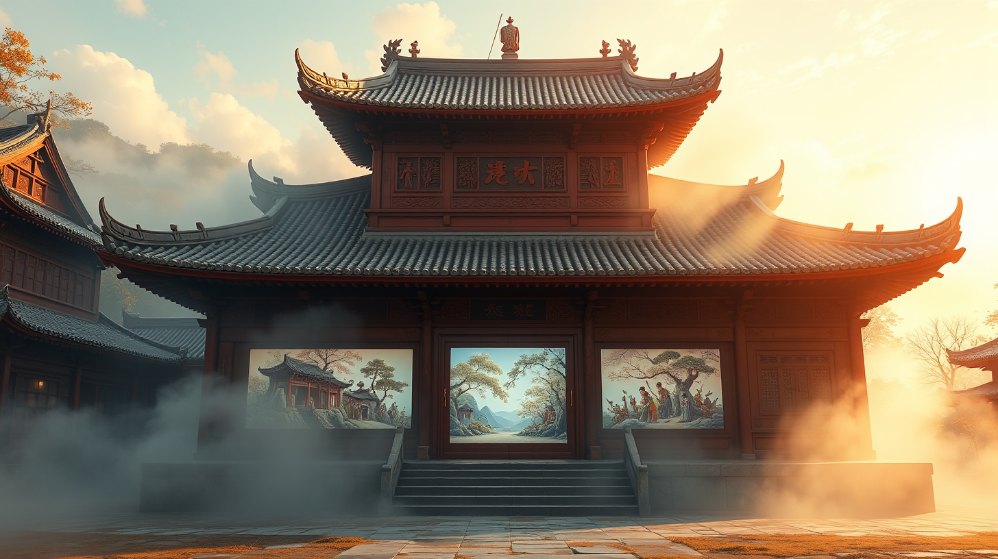 作图提示词:Front view of Jimei ancient village restoration scene, showcasing advanced restoration techniques with digital displays illustrating the intricacies of wood carvings on the vermilion ancestral hall walls, morning mist enveloping the structures, under warm and soft artificial sunlight.