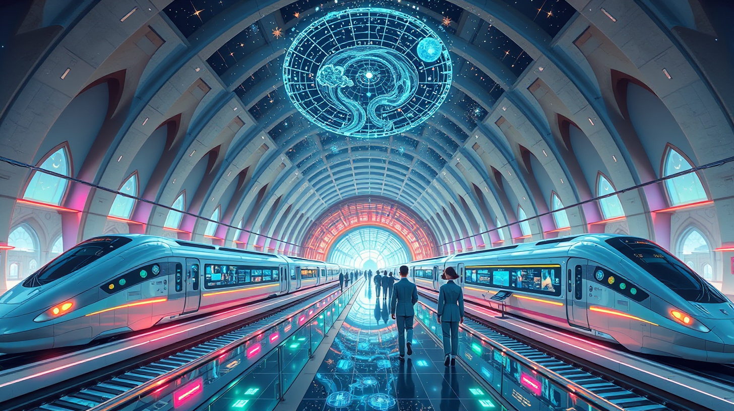 作图提示词:Inside a futuristic high-speed rail hub, architecture inspired by the elegant curves of bronze ding stands tall. The vaulted ceiling showcases a celestial star map projected in vivid colors, while magnetic trains, designed with hints of ancient jade craftsmanship, glide silently along the platforms. Holographic gravity strings glow in a mesmerizing sapphire blue, as engineers dressed in hanfu-style uniforms interact with floating control panels. Neon lights, harmonizing bronze and jade palettes, illuminate the space, casting colorful reflections on prismatic glass walkways.