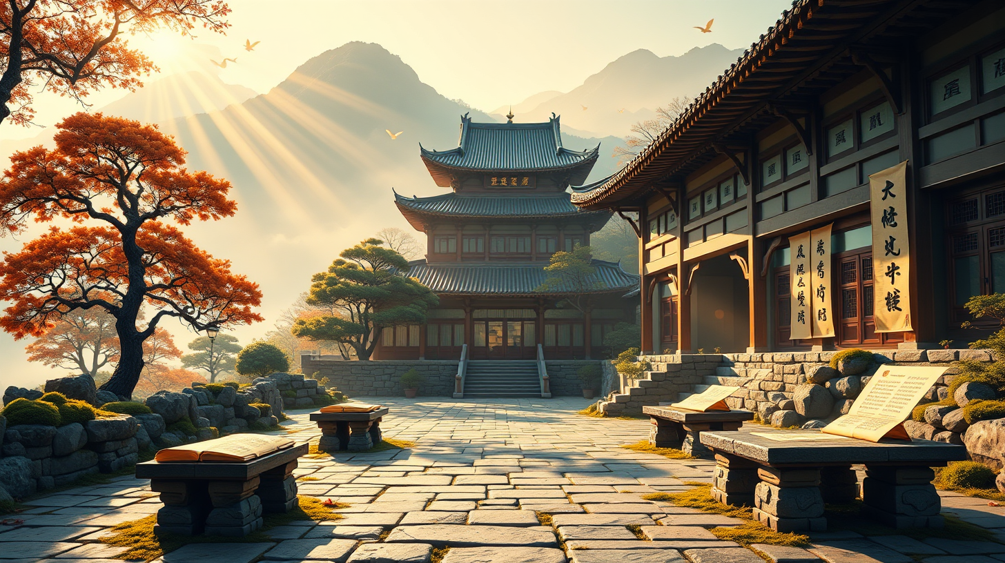 作图提示词:At dawn, the ancient Songshan Mountain stands majestically, featuring traditional Chinese academy architecture with elegantly curved eaves. Holographic inscriptions inspired by oracle bones gently float in the misty air, while sun rays filter through vibrant cypress trees. The stone-paved courtyard, adorned with moss, is illuminated by warm golden hour lighting, creating a tranquil atmosphere. Academic scrolls rest scattered on weathered stone benches, embodying the dialogue between ancient wisdom and modern exploration.