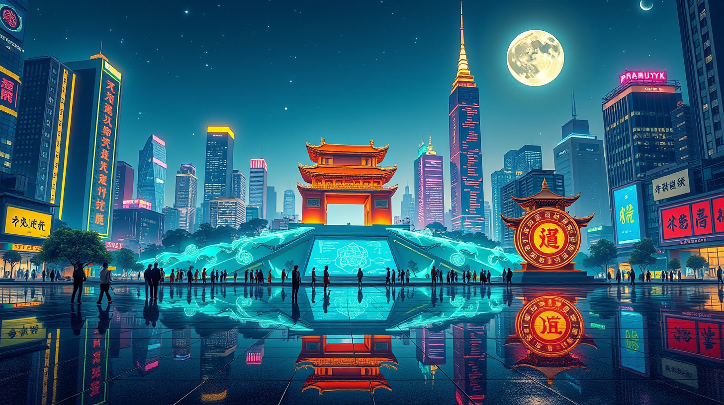 作图提示词:The metropolis nightscape is awash in vibrant colors, dominated by a monumental bronze ding structure. Holographic cultural motifs cascade elegantly down the sleek facades of skyscrapers, while citizens creatively project their brainwave patterns onto fragments of ancient relics nearby. Neon-lit calligraphy, reminiscent of bronze inscriptions, dances in the city lights, and laser projections of Zhouyi hexagrams rotate captivatingly in midair. Moonlight glimmers on the reflective black mirror pavement, creating a stunning double exposure effect that bridges time.