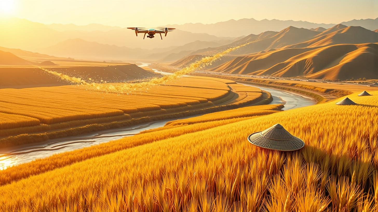 作图提示词:Golden wheat fields stretch alongside the flowing Yellow River, where modern geometric holograms illustrating innovative water conservancy projects hover gracefully above the crops. Amber-colored particles of light intertwine with the wind, while modern irrigation drones, resembling ancient farming tools, navigate through the fields. The terracotta-colored loess plateau provides a rich backdrop, as warm afternoon sunlight casts long shadows across rippling wheat, enhancing the dynamic patterns of nature. Traditional straw hats rest on the field ridges, blending past and future.