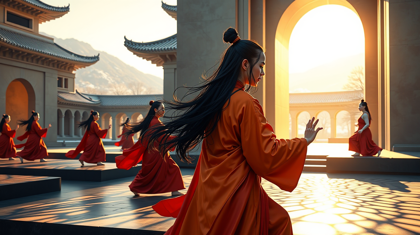 作图提示词:A beautifully lit view of a winter solstice architectural complex showcasing the graceful movements of Shaolin monks with black, flowing hair dressed in elegant, vibrant silk robes engaging in Tai Chi, juxtaposed with sleek quantum robots, bathed in golden sunlight that highlights intricate shadow patterns on dark platforms, emphasizing the contrast between warm amber and cool metallic tones.