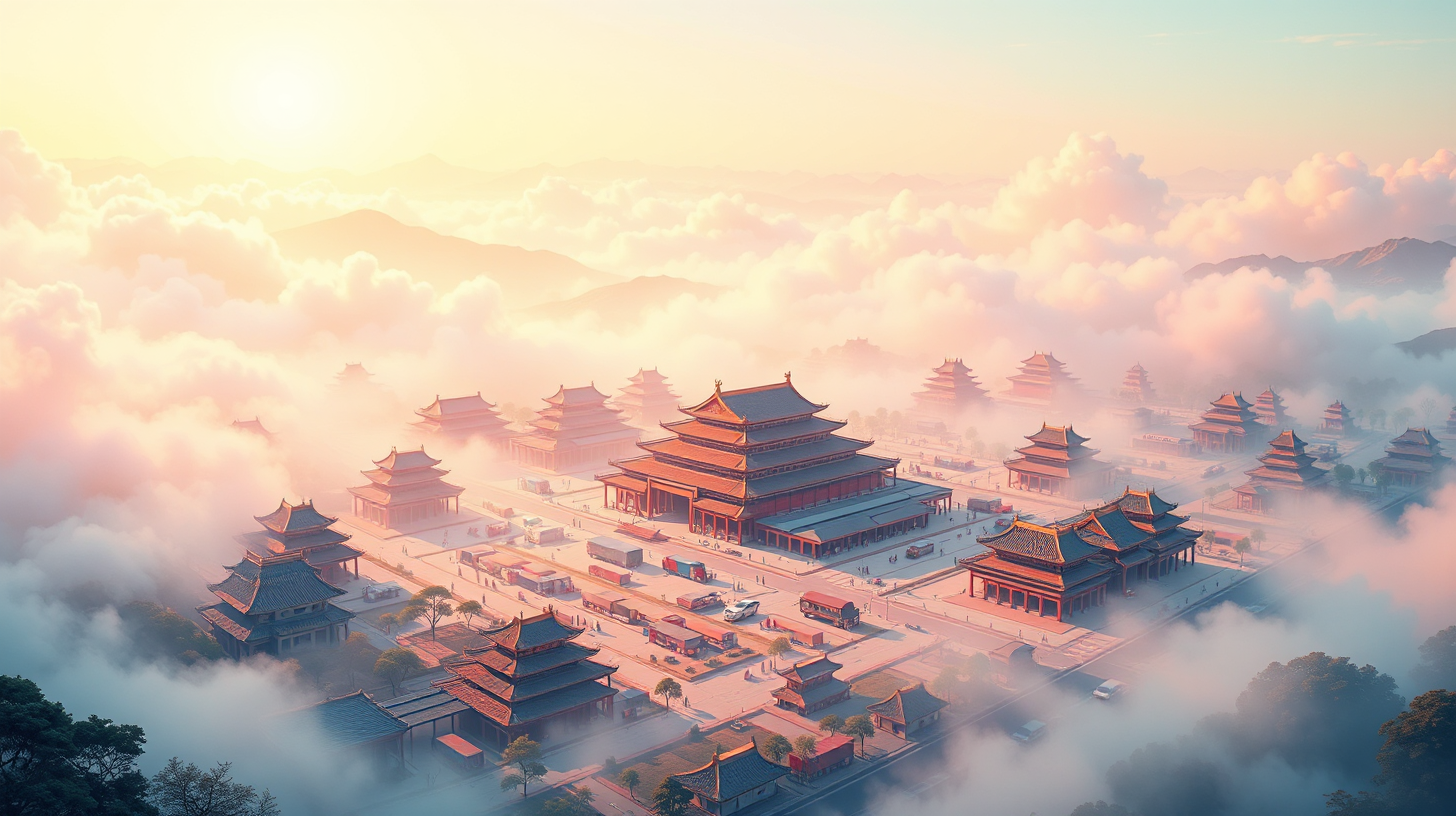 作图提示词:Aerial perspective of a contemporary logistics park that harmoniously integrates elements of traditional architecture, with advanced logistics systems seamlessly merging with historical Silk Road motifs, illuminated by the soft morning light that filters through artistic, prismatic fog, creating a dynamic interplay of colors.