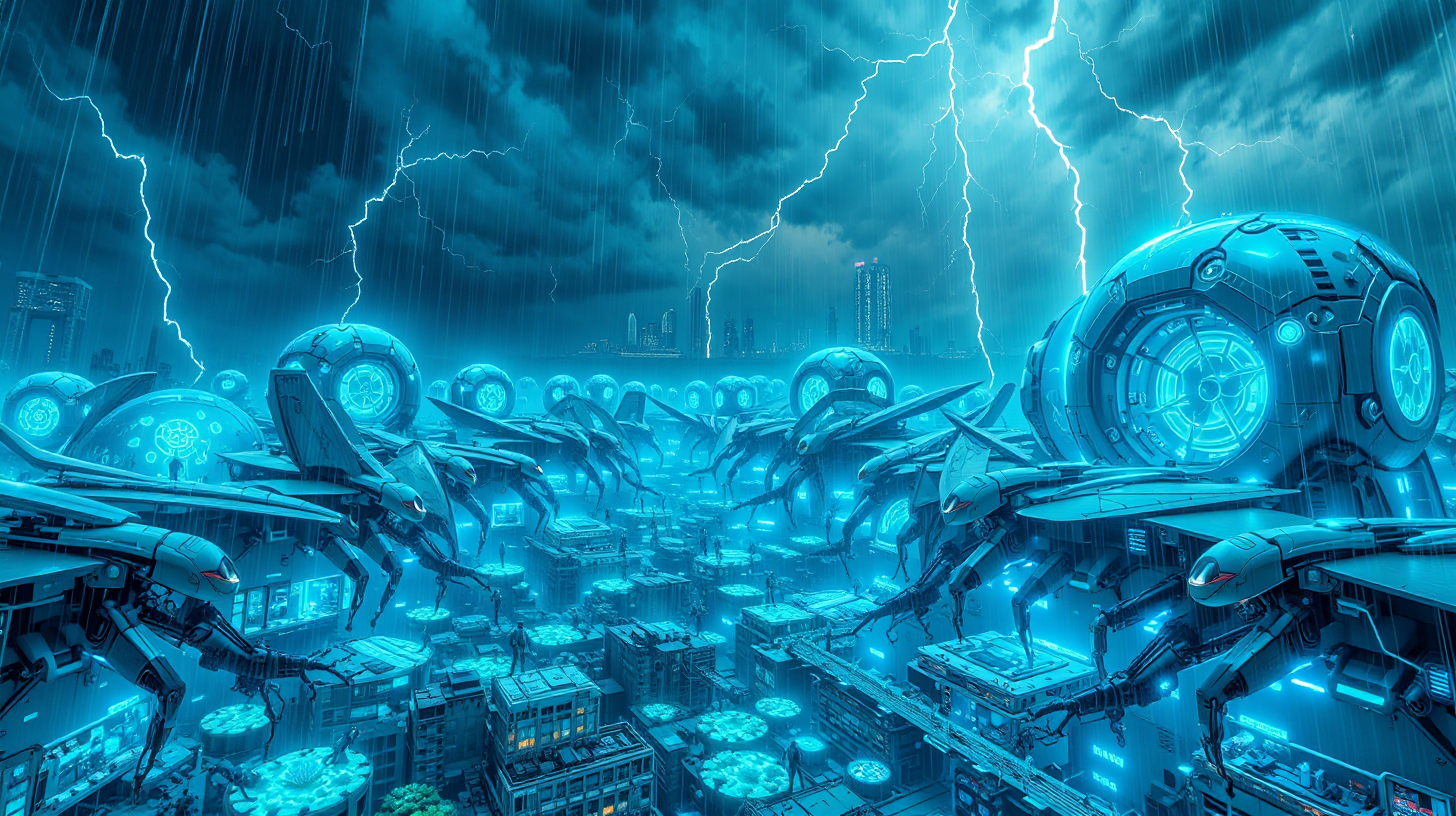 作图提示词:An ultrawide aerial view of the futuristic Victoria Harbour seabed in Hong Kong, showcasing thousands of cleaning mechs with reflective surfaces that unfold wing-like structures. Glowing anti-pressure nanocells form geometric energy domes amidst a typhoon, while neon-blue lightning strikes illuminate intricate mechanical details. Torrential rain creates liquid light trails on nanotech surfaces, and a swarm of robots glides over bioluminescent coral reefs glowing beneath. The composition highlights the storm’s fury intertwined with technological splendor, featuring hyper-detailed mech textures and hydraulic joints, alongside flowing bioluminescent data streams in submerged infrastructure, with cinematic chromatic aberration effects from energy shields.