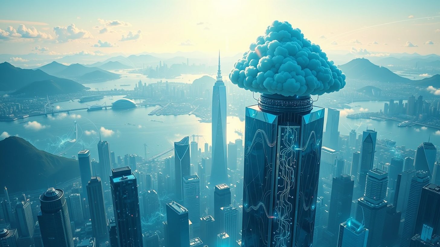 作图提示词:Neural pulse-shaped cloud servers rotate atop Victoria Peak, with sunlight refracting through crystalline data towers. Dynamic reliefs on skyscrapers change with thought ripple emissions, offering an aerial view of hidden quantum oceans and the city silhouette. The silver-blue color scheme, with prismatic flares, creates a monumental contrast against delicate light patterns. An ethereal atmosphere merging technology and emotion is captured in an ultra-wide shot that portrays energy fields converging above the city.