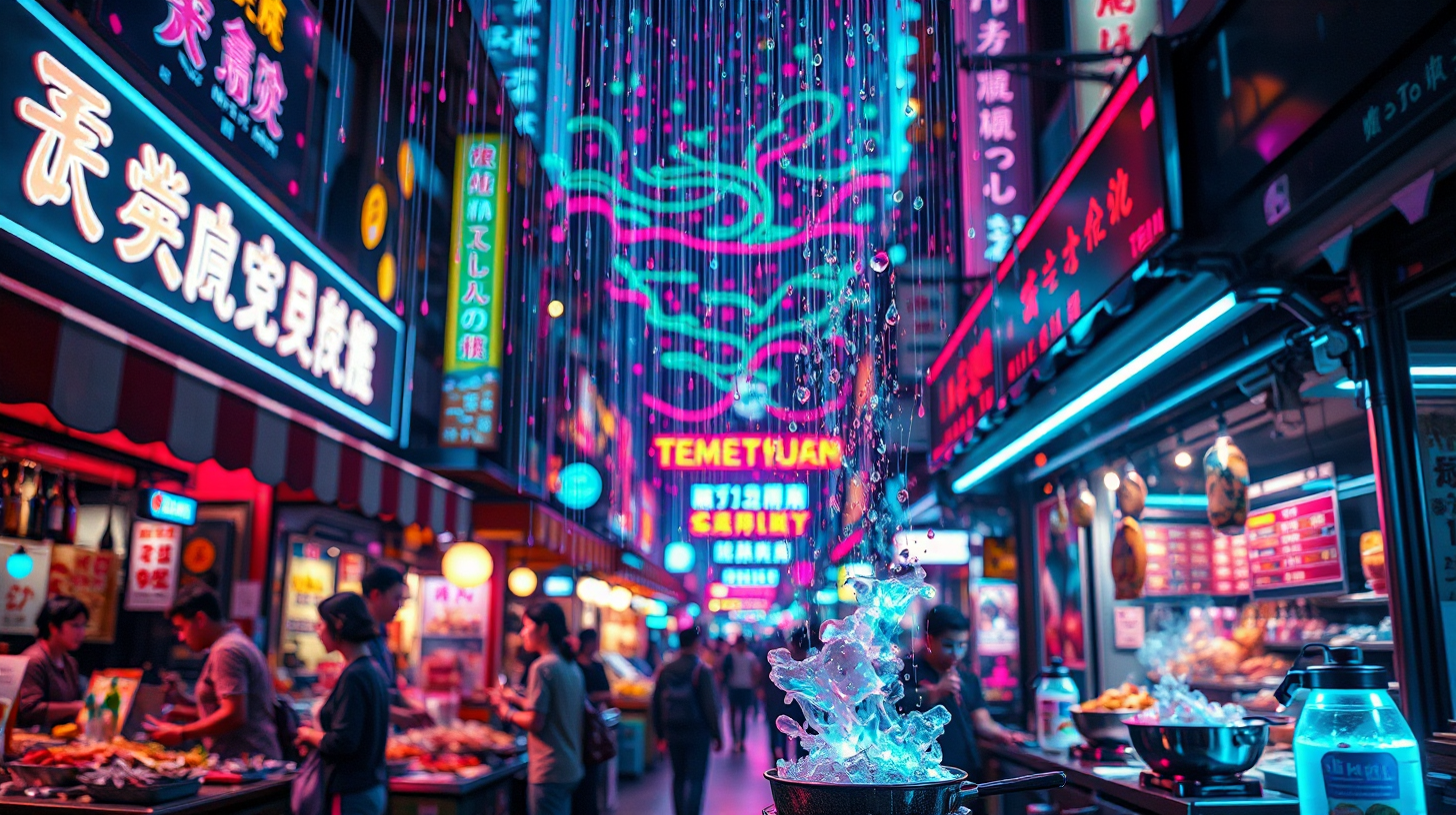 描述:庙街的夜市在夜色中沸腾,可编程霓虹雨如梦幻般从天而降。情感算法架构师专注地调试着液态光粒子,让它们在空气中编织出绚丽的图案。摊主们熟练地使用AR炊具烹饪着分子点心,发光的蒸汽在接触食客视网膜的瞬间,生成专属的风味记忆。当霓虹雨触及麻婆豆腐的红油,每一滴都绽放出蜀绣纹样的全息烟火,将市井的热闹与科技的奇幻完美融合。