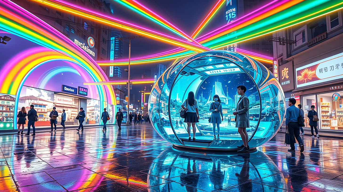 作图提示词:Rainbow magnetic levitation light tracks crisscross above the streets of the Central district, where citizens are entering translucent capsules designed for immersive experiences. Holographic relief projections blend historical fishing port scenes with flowing digital finance data streams. Reflective pavement mirrors prismatic lights, viewed from the interior of a capsule that reveals layered realities. Neon and gold lighting create chromatic aberration effects, establishing a surreal atmosphere of temporal convergence.