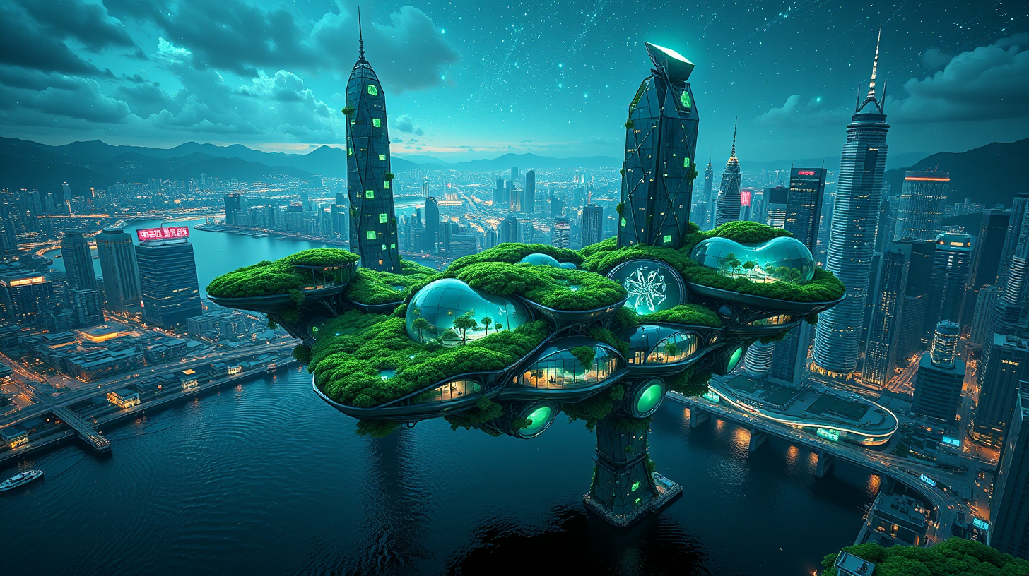 描述:夜幕下的维港上空,翡翠色拓扑建筑群如灵动的生命体般悬浮着。模块化单元不断变幻,时而化作高耸的金融塔楼,时而变为梦幻的艺术飞岛,时而又成了充满生机的生态胶囊。量子苔藓在玻璃幕墙缓缓流淌,宛如发光的藤蔓,将二氧化碳转化为希望的能量。整座城市在夜色中闪烁,如同呼吸着的璀璨星群,展现出科技与自然共生的奇妙景象。
