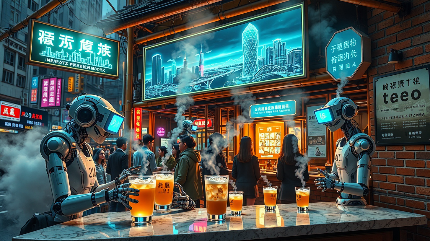 作图提示词:A twilight scene at a cyberpunk street corner in Mong Kok, featuring robotic arms with holographic interfaces that blend quantum milk tea in crystalline cups. Neon signboards project nostalgic memories of the Hong Kong skyline, while customers wearing neural-link visors immerse in shared sensory experiences. Steam rises from the quantum teapots, refracting into prismatic clouds, and the retro-futuristic shop elegantly combines bamboo scaffolding with carbon fiber framing. Programmable liquid topping droplets hover mid-air, and augmented reality menus float above terrazzo countertops. Warm amber lighting contrasts vividly with cyan holograms, while hyper-detailed textures on aged brick walls embedded with smart sensors complete this dynamic composition that merges traditional tea culture with transhumanist aesthetics.