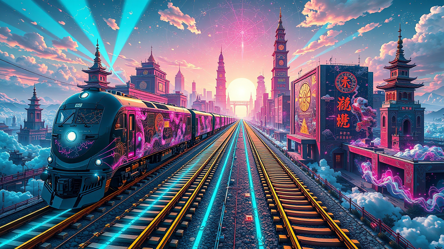 描述:货运列车的笛声如同一把神秘的钥匙,化作激活码,瞬间唤醒了建筑幕墙中的量子云。商周饕餮纹在量子云中若隐若现,仿佛穿越时空而来。铁轨泛着金辉,沿郑韩故城遗址延展成光年尺标,车头探照灯在云端投射出张衡浑天仪的全息模型。楼宇玻璃随共振频率切换为青铜透光镜模式,星空投影与甲骨文星图在电离层交叠,形成一幅壮丽的四维星表,上演着一场震撼人心的时空共振。