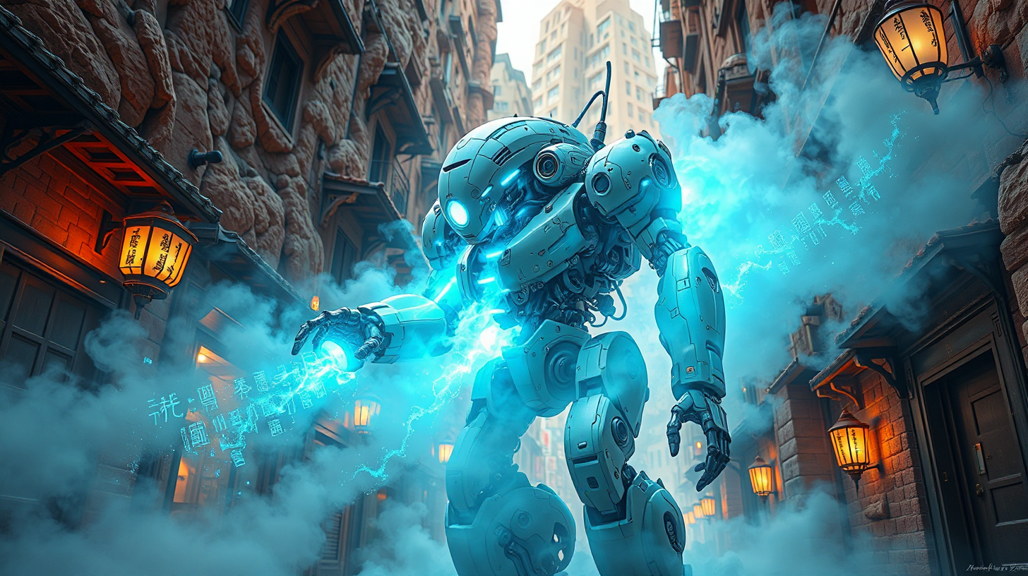 作图提示词:A futuristic mecha inspired by ancient Chinese rock grottoes navigates a narrow urban alley, with mechanical arms applying a luminous cultural gene-repair gel, set against a backdrop of neo-futuristic architecture merging terracotta textures and quantum circuit designs. Neon-blue lighting radiates from the mecha’s core, creating an interplay with the warm glow of street lanterns while holographic oracle bone inscriptions drift within the gel mist. The scene is captured from a dramatic low side angle, highlighting intricate mechanical details and dynamic motion.