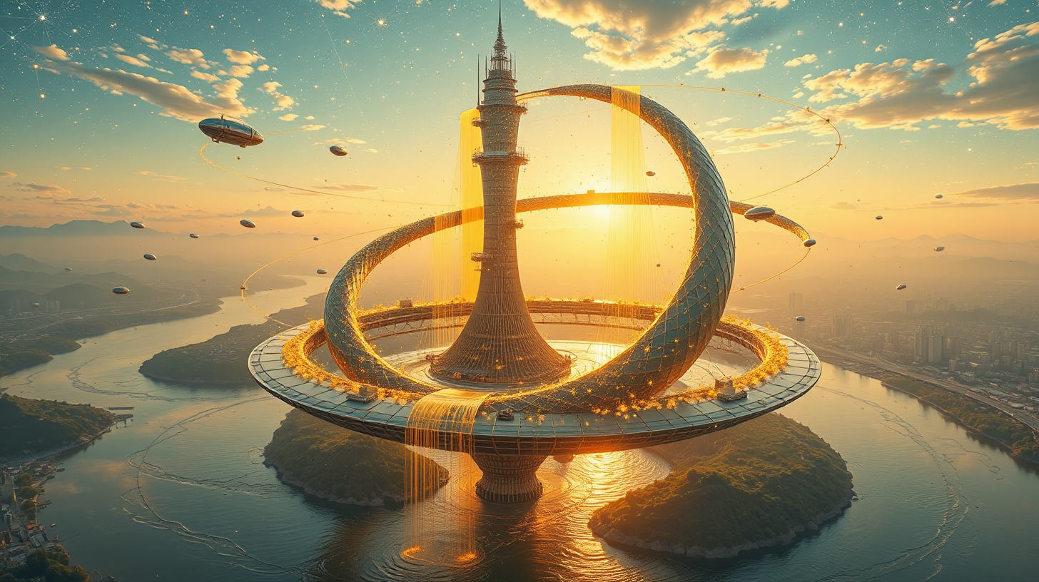 作图提示词:An aerial view of a colossal toroidal space tower gracefully floating above the Yellow River, its topological structure pulsating with streams of golden hydrological data. Quantum logistics capsules orbit the tower like stars in an ultrawide shot, showcasing a fusion of fluid dynamics and celestial mechanics. Iridescent water particles coalesce into mathematical constellations, while dawn light refracts through a prismatic force field, blending nature and technology.
