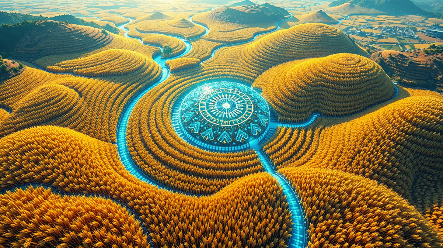 作图提示词:A bird’s-eye view of a futuristic agricultural matrix with golden wheat fields undulating in cerebral wave patterns. Photonic enhancement particles dance gracefully between the ears of grain, while fractal irrigation channels shine with bioluminescent blue. Cybernetic terraces arrange themselves into mandala patterns, as solar flares refract through a prismatic force field, creating a vibrant contrast between amber crops and neon-tech infrastructure.