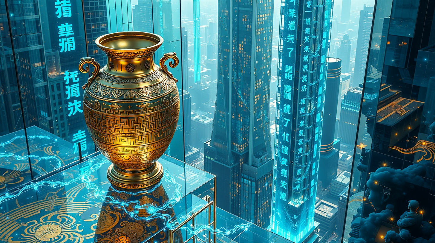 作图提示词:An extreme close-up of intricate Shang Dynasty bronze vessel patterns displayed on sleek, transparent architectural surfaces. These ancient motifs blend seamlessly with streams of hovering oracle bone script projected in holographic blue, viewed from a bird’s-eye perspective that captures reflections of crystalline skyscrapers. The color palette features metallic gold and azure, enhanced by luminous particle effects, encapsulating a cyberpunk ambiance where historical artifacts harmonize with quantum technology.