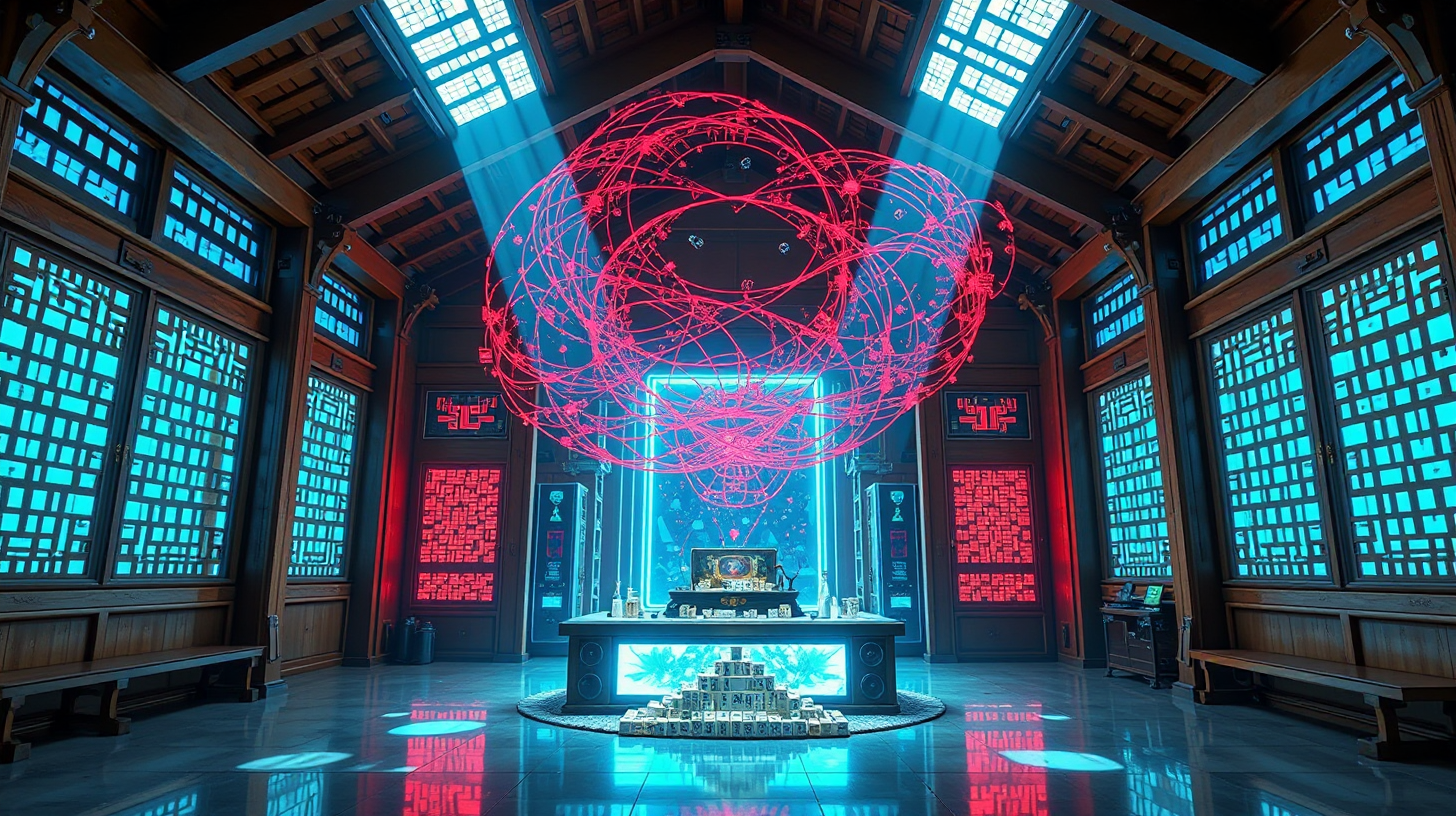 作图提示词:A front view of a futuristic laboratory housed within an elevated structure, featuring holographic programmatic poetry swirling around a light-based computing terminal. Neon-red data streams reflect intricately on traditional wooden beams, with a cybernetic altar showcasing digitized Mahjong tiles. Blue light from quantum servers illuminates intricately carved lattice windows, merging Ba-Shu architectural heritage with cyberpunk technological elements in a cohesive design.
