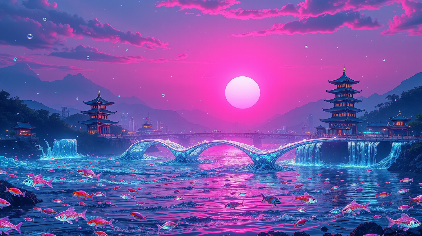 作图提示词:A dynamic perspective featuring a quantum water curtain at the confluence of rivers, with schools of bioluminescent fish forming flowing, living bridges. Holographic seed pods disperse from ecological simulators, with prismatic refractions of lights from Chaotianmen port captured in water droplets. A neon-magenta sunset backlights cybernetic pagodas, illustrating a hyperrealistic fusion of hydrology and quantum physics, emphasizing the beauty of coexistence.