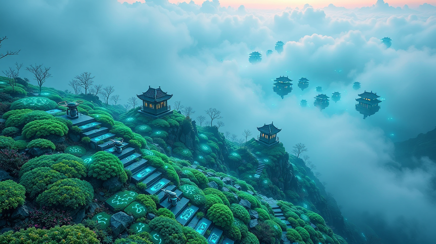 作图提示词:An aerial view of a futuristic landscape featuring glowing quantum moss on mountain steps, bioluminescent blue-green patterns that pulse rhythmically, along with cleaning drones hovering with holographic interfaces amidst stone steps. Clusters of floating teahouses appear in the distance beneath a thick fog that diffuses neon-blue lighting, showcasing a cybernetic ecosystem harmonizing traditional Chongqing architecture with advanced quantum technology, capturing ultra-detailed sci-fi aesthetics.