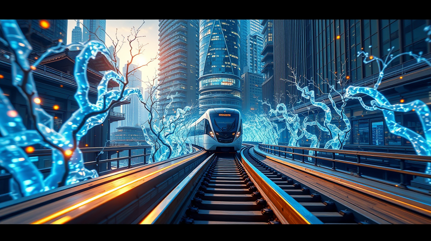 作图提示词:A close-up shot of a light rail smoothly transitioning through a modern, quantum-enhanced skyscraper, where advanced crystalline designs entwine with the infrastructure. Glowing data vines elegantly wrap around the tracks, contrasting with the traditional Diaojiaolou architecture, while ethereal blue-white lighting punctuated by occasional golden energy flares brings forth a dynamic sense of motion. The medium shot offers a unique perspective along the maglev tracks, capturing the intricate details of nano-circuit designs integrated with natural wood textures.