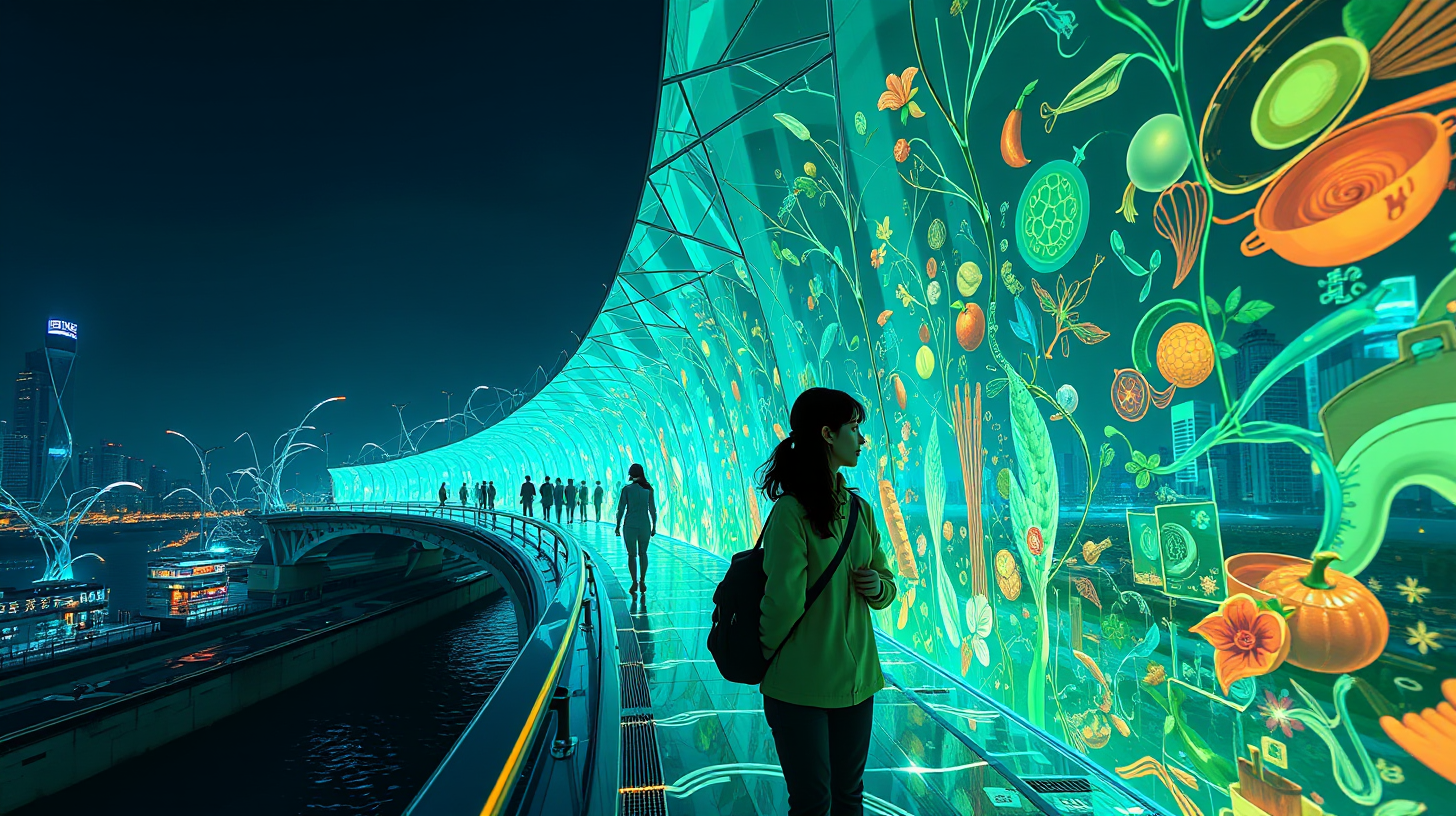描述:跨江磁悬浮走廊内,五彩斑斓的磁力藤蔓绽放出全息红油图腾,通勤者手握的分子料理盒投射出九宫格光影,仿佛将火锅的香气化作了可见的光谱。玻璃步道下,两江数据流潺潺流动,明朝城墙砖的纹路与量子纠缠图案相互重叠,形成了一幅跨越时空的画卷。发光的巴渝图腾藤蔓自动避让行人,将磁器口的叫卖声编译成霓虹光影秀,让每一次穿行都成为一场视觉与听觉的盛宴。