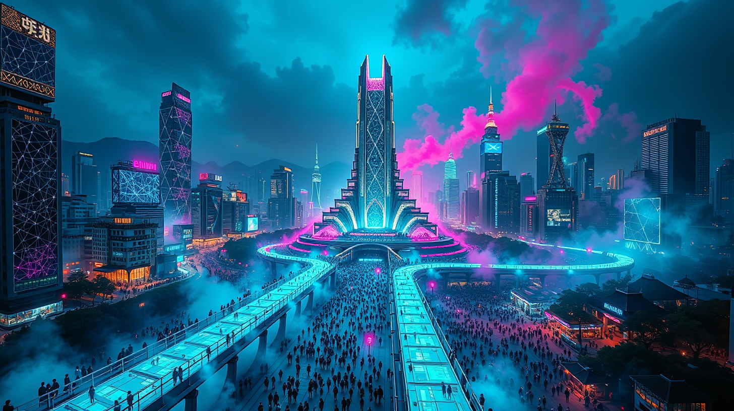 描述:跨年夜的解放碑前,钟声化作数据脉冲,在玻璃幕墙间奔腾流淌。量子苔藓在建筑缝隙间忽明忽暗,与天际流转的粒子护盾共振出绚丽的霓虹光谱。磁悬浮走廊在楼宇间划出星轨般的弧线,地面投影着巴渝古篆演变的全息图腾。市民们佩戴着生物电采集手环,随着音乐的节奏翩翩起舞,粒子护盾在他们的周围变幻着色彩,仿佛将集体的希望化作了可见的光芒。朝天门码头悬浮的灯笼阵列骤然亮起,千万个光子年轮在空中绽放,为这座未来之城披上了一层梦幻般的彩衣。