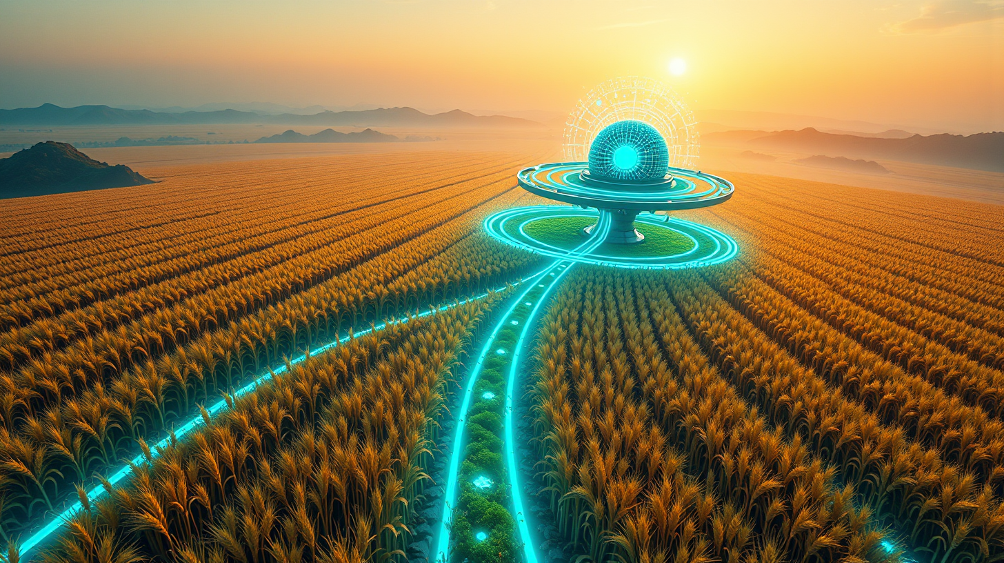 作图提示词:Wide-angle aerial view of quantum wheat fields at dawn, geometric crop rows illuminated by pulsating data waves. Energy-field sensors project cyan holograms above wheat ears. Floating spacetime hub with concentric starburst rings overlooks reconstructed Song Dynasty stone post roads glowing with bioluminescent moss. Soft morning rays blend with neon-blue quantum energy streams through atmospheric diffraction, hyperrealistic textures with controlled chromatic aberration, vibrant gold and teal color scheme, cyber-agricultural composition