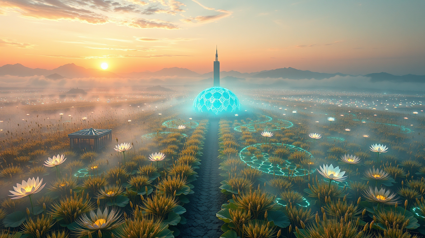 描述:破晓时分,弥漫的薄雾竟是纳米机器人集群的伪装,它们在夜色中收集的城市数据流,正被重组成一株株发光的麦苗,在晨风中轻轻摇曳。清洁机器人方阵迈着整齐的步伐,引领晨练人群跳起拓扑学太极,每一个招式都在空气中划出数据的轨迹。建筑群如苏醒的巨兽,舒展着仿生结构的“花瓣”,迎接第一缕朝阳,量子麦田矩阵与未来主义建筑在晨光中达成微妙的量子纠缠。