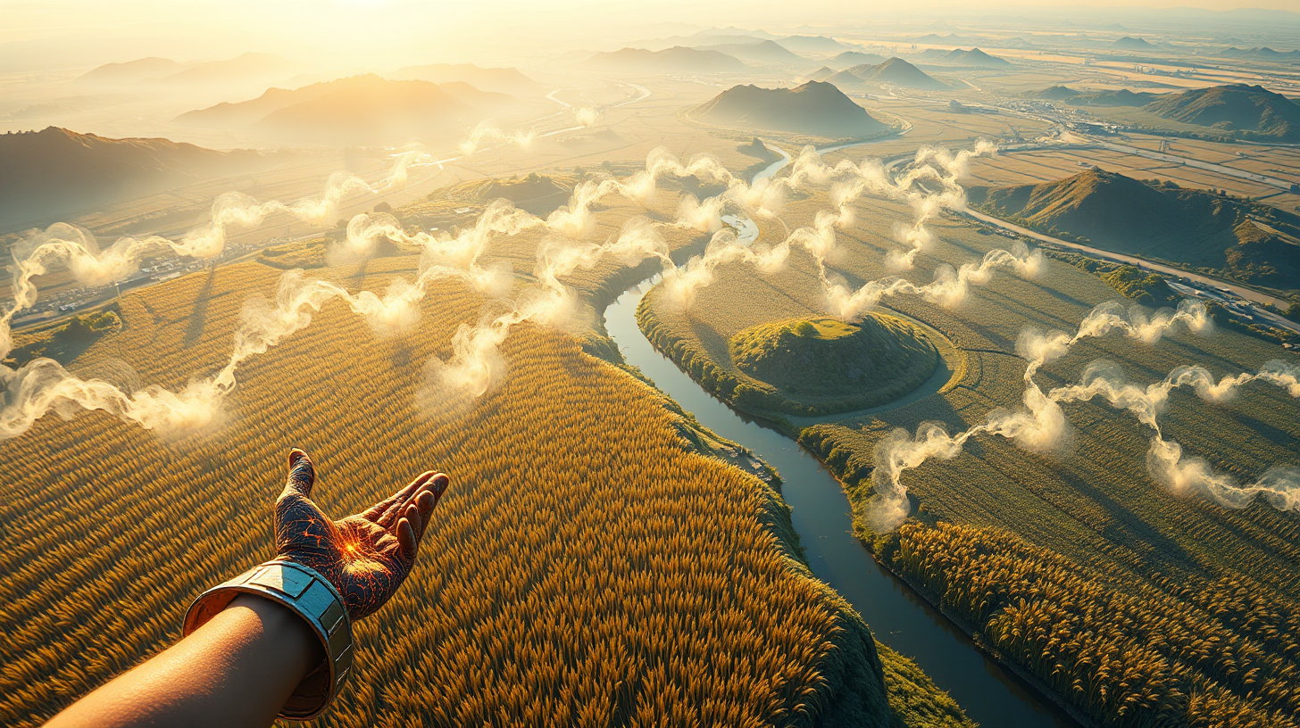 故事发生在中国河南驻马店,当现代科技的锋芒悄然探入古老文明的肌理,量子麦田在晨曦中泛起数据涟漪,星环枢纽悬浮于宋代驿道遗址之上,纳米机器人于丹霞绝壁编织修复矩阵,甲骨文在博物馆外墙解构为量子电路。科技以温柔的姿态重构传统农业与文化,让地质公园的岩石记忆与城市能源网共振,使丰收的喜悦化作光粒子图腾,在虚实交织的时空中,谱写出一曲硅基与碳基文明共生的诗篇。