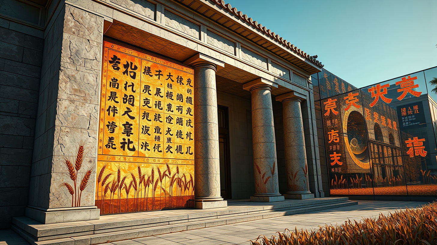 作图提示词:Close-up of museum facade featuring dynamic oracle bone script transforming into quantum circuit patterns. Archaeologists’ laser scanners project holograms of Shang Dynasty farming tools onto Han-style stone columns. Solar term projections merge with photonic crop data on adjacent smartglass walls. Dramatic side lighting with controlled chiaroscuro, vermillion and iron-black contrast, typography animations showing wheat growth cycles