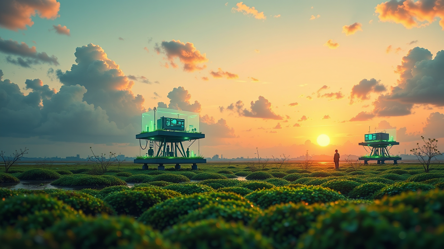 作图提示词:Modular bioreactor platforms above marshes with genetically-enhanced moss emitting circadian bioluminescence. Researchers monitor holographic dashboards via motion-sensing interfaces under twilight. Shot from low angle with 35mm prime lens, emerald bio-energy fields interacting with sunset clouds using long exposure techniques.