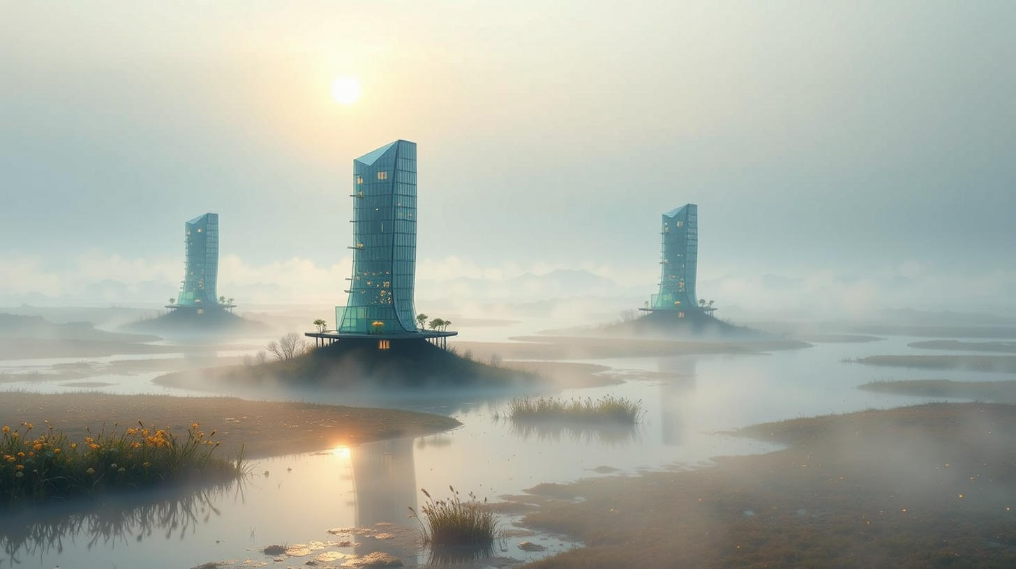 作图提示词:Morning mist over wetlands with suspended eco-towers using curved photovoltaic glass refracting dawn light into prismatic patterns, golden particles above tidal flats captured through aerial drone photography. Sustainable architecture blends with ecosystems using cold-toned palette and amber accents, rendered with volumetric fog lighting and ultra-wide dynamic range composition.