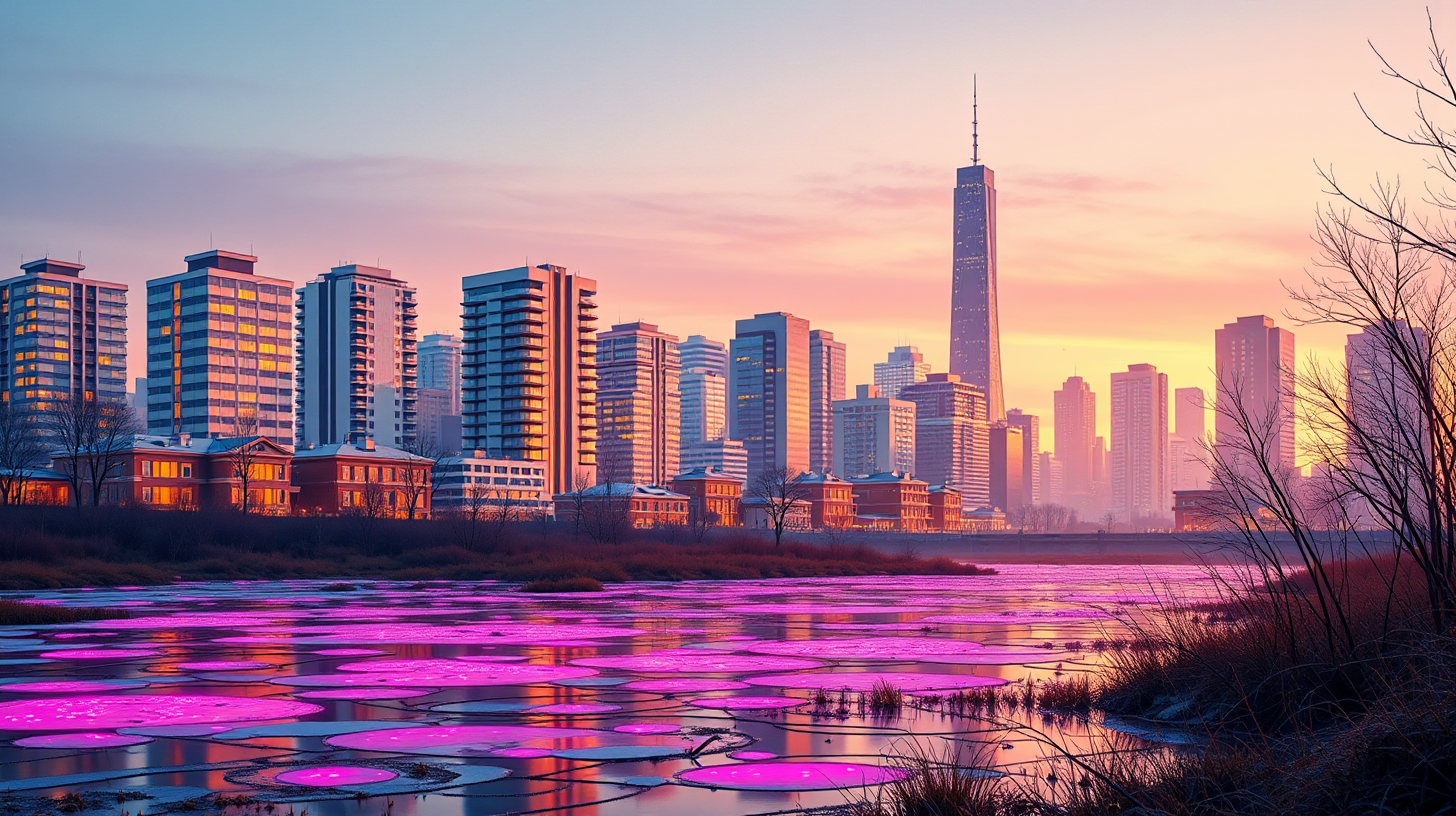 作图提示词:Winter solstice urban landscape with phototropic building facades responding to tidal energy rhythms, coastal wetlands displaying synchronized microbial bioluminescence. Captured in golden hour using 16-35mm zoom, warm amber and magenta hues blending through graduated ND filters, time-lapse exposure showing city-ecosystem harmony.