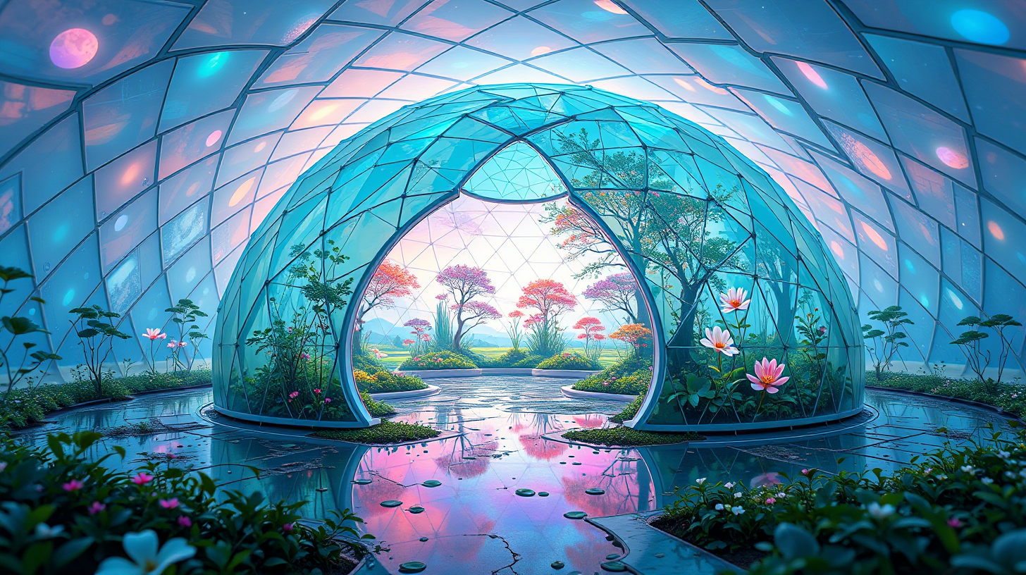作图提示词:22nd-century biotech dome with adaptive nursery chambers featuring semi-transparent membranes displaying real-time holographic projections of Jiangsu wetland ecosystems, using cinematic wide-angle composition with shallow depth of field to emphasize layered organic structures, illuminated by dynamic circadian lighting system casting ethereal chromatic aberrations across faceted surfaces, incorporating biomimetic design principles with iridescent chameleon-like color transitions.