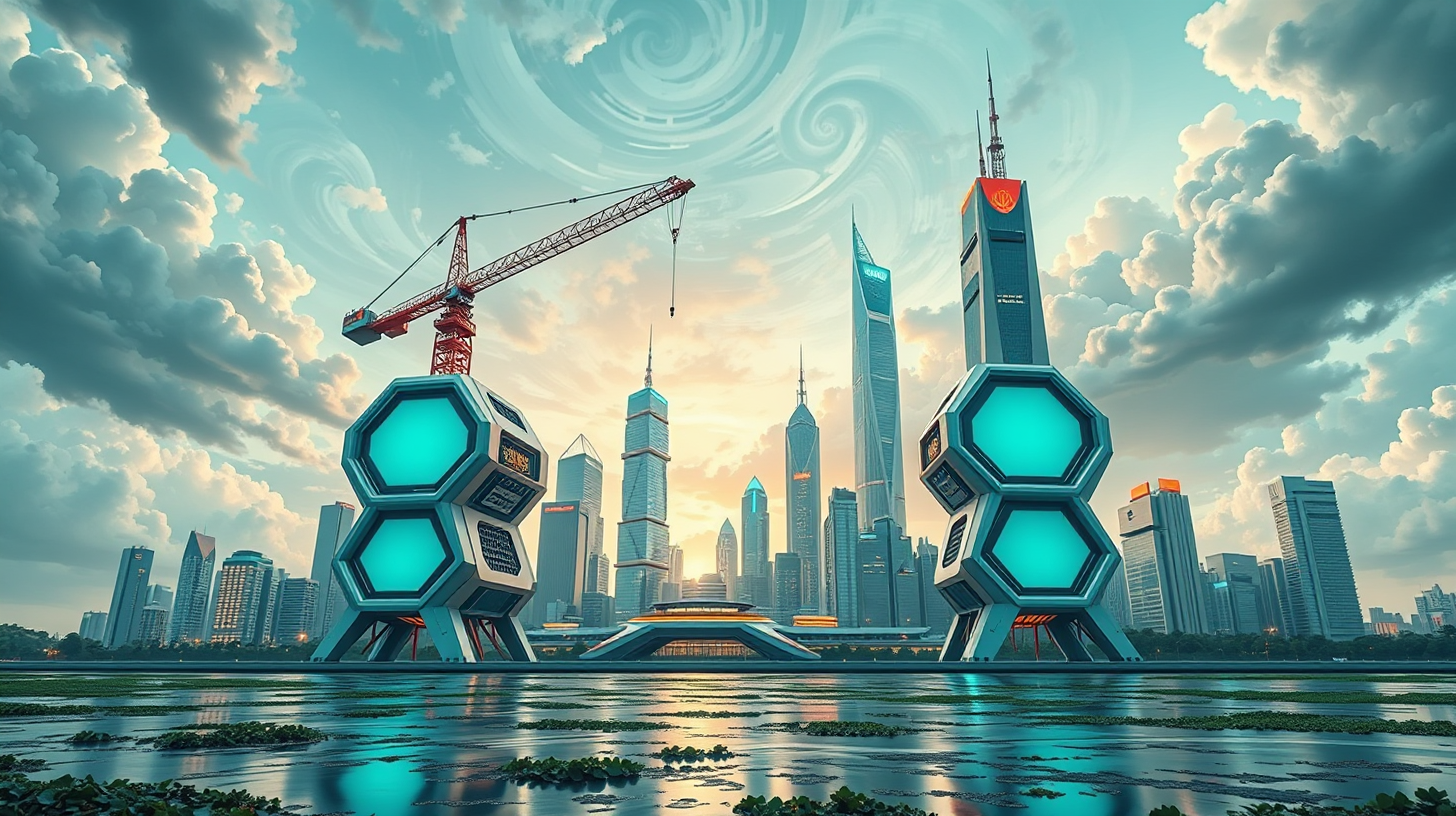 作图提示词:Sustainable smart city skyline with modular defense drones featuring kinetic crane-inspired articulation, forming hexagonal energy shields harnessing tidal forces from Yancheng’s coastal wetlands, captured in dramatic low-angle perspective using 24mm lens with extended exposure to blur swirling storm clouds, illuminated by pulsating aquamarine emergency beacons reflecting on hydrodynamic alloy surfaces, implementing color theory through complementary teal-orange palette balancing technological and natural elements.