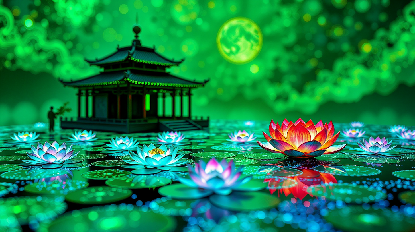 作图提示词:Macro side-view of photonic maglev conduit surface displaying fluid dynamics of code-choreographed tea rituals, temple projection generating fractal lotuses through atmospheric holography, iridescent patterns formed by quantum dot illumination, captured with probe lens at f/1.2 for shallow depth-of-field, transitioning from jade-matrix greens to quantum-blue tones with holographic ink detailing --chaos 25 --quality 2