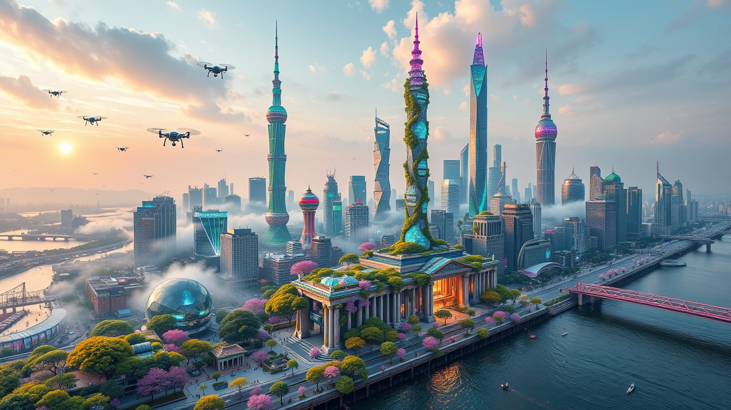 作图提示词:Ultra-wide aerial view of Shanghai Bund’s quantum-lichen coated skyline, crystalline vines enveloping Expo-era columns and neo-futuristic towers, photonic cleansing drones synchronizing with bio-circuitry ecosystems, chromatic mist dispersion across Huangpu River, dawn light refracting through prismatic neo-baroque structures, captured with deep focus using holographic lens array, cyber-organic fusion in neon-cyan and quanta-purple spectra --ar 21:9 --style futuristic