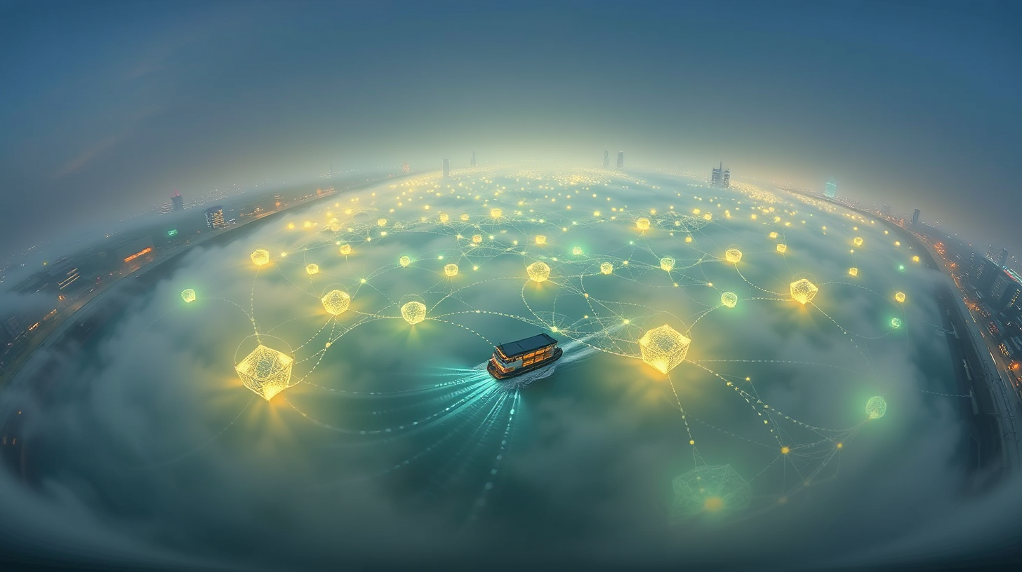 作图提示词:360-degree aerial panorama of Suzhou River’s morphodynamic fog lattice, quantum nodes resembling bioluminescent steam baskets in morning haze, delivery craft generating phosphorescent fractal trajectories, captured with gyro-stabilized gimbal using long exposure for mist dynamics, chrome-yellow energy fields contrasting with pearl-white nano-structures under cold morning light --ar 3:1 --style cybernetic