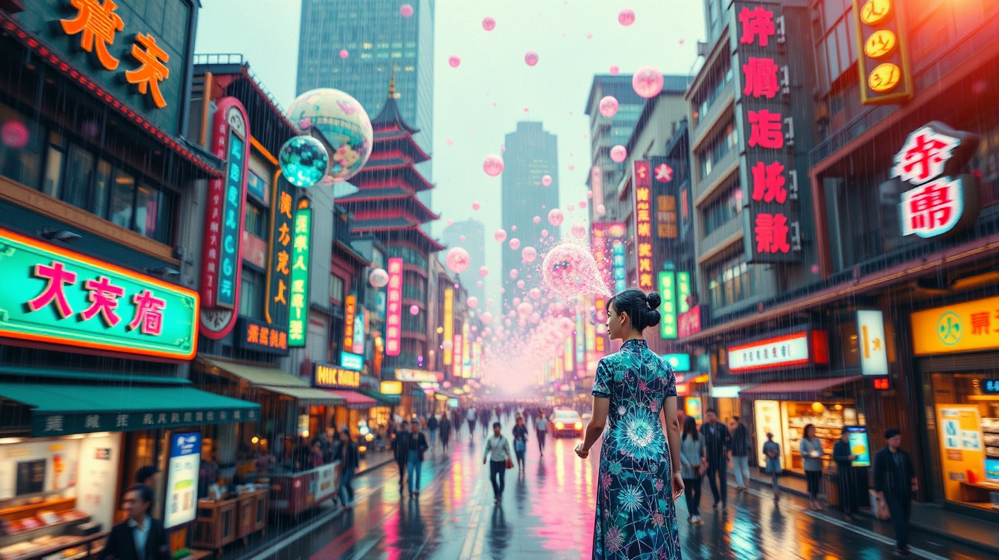 作图提示词:Medium-long shot of Nanjing Road’s holographic cheongsam avatar navigating flux-lattice pathways, retro-futuristic signage pulsating with quantum Suzhou harmonics, memory orbs crystallizing in fractal patterns above street level, bokeh effects accentuating chromatic flux in rain-slicked atmosphere, captured with vintage anamorphic lens producing golden-hour flares in magenta and electrum hues --v 6.0 --stylize 850