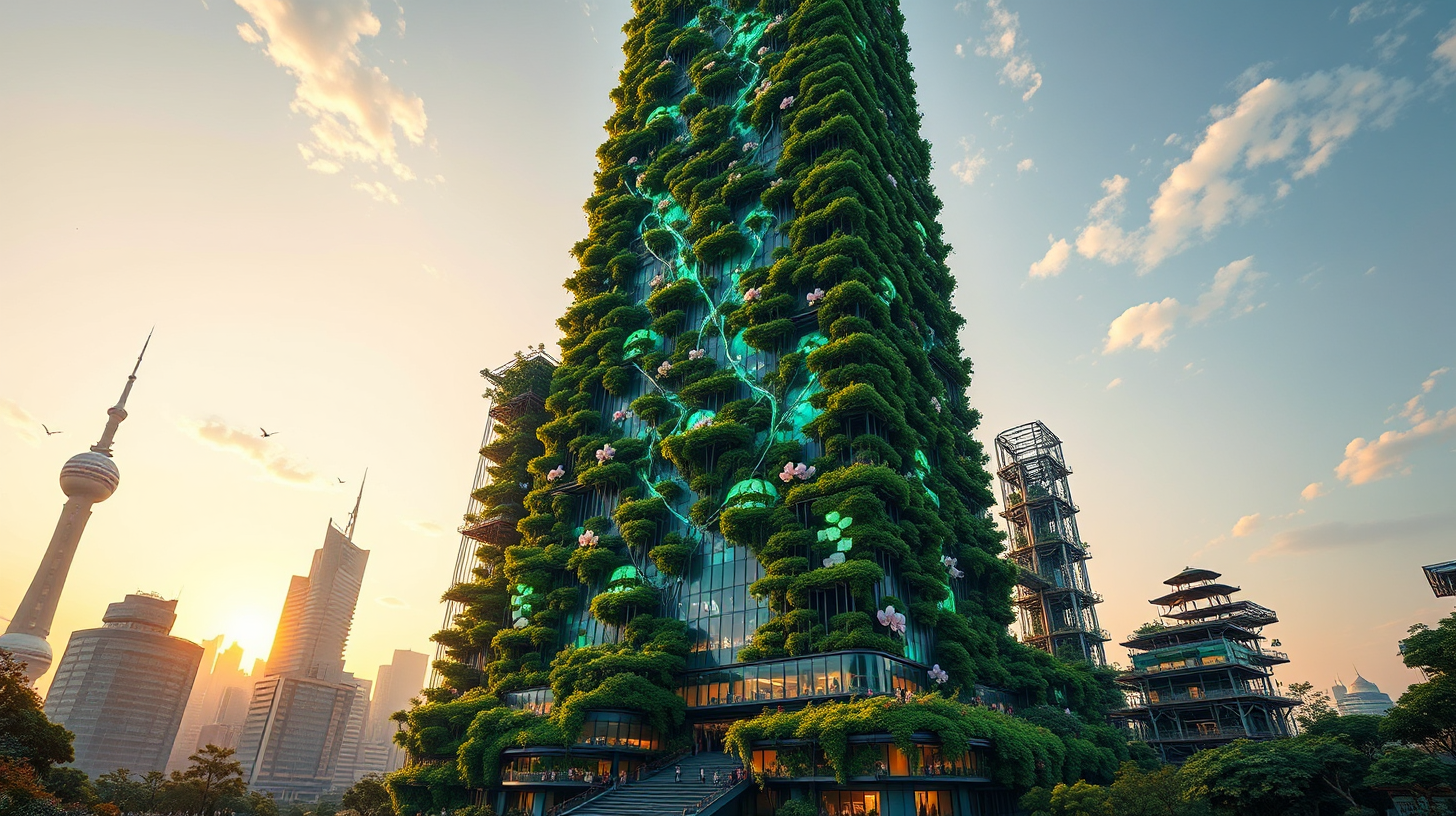作图提示词:Futuristic Shanghai Tower neurogarden at golden hour, quantum moss-covered facade with holographic jade orchid neural interfaces, luminous programmatic poetry cascading through vertical garden cables. Semi-transparent smart membranes projecting quantum gardening choreography, piano-resonant thought waves pulsing in neon cyan and quantum green. Hyperdetailed neo-futurist architecture with cinematic chiaroscuro, blending Han dynasty motifs with cybernetic aesthetics, ultra-wide angle perspective emphasizing 1200m bioluminescent vertical farm structures.