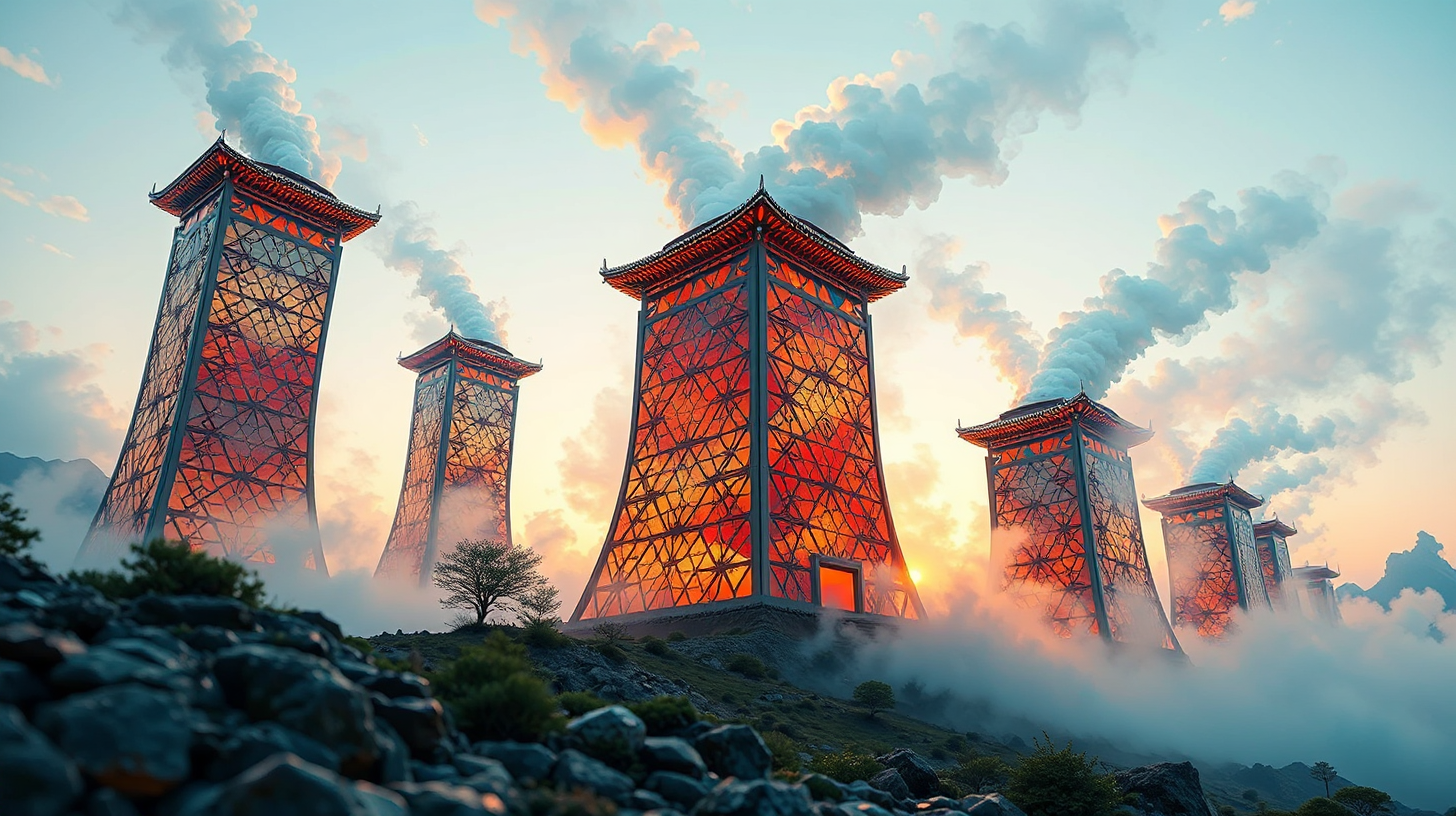描述: dawn时分,温泉区七座地热共振塔在蒸汽中苏醒。低角度仰观,自适应记忆金属塔面折射出壮锦纹样,矿物蒸汽缭绕其间。太赫兹扫描下,琥珀与 Chrysocolla 光谱中的晶体晶格清晰可见,容积光捕捉着铁磁流体的波动。传统壮锦纹样与光谱成像数据多重曝光,液态金属的赭红辉光与金色纹样交叠,科技与民族记忆在此共振,温泉之韵化作流动的艺术。