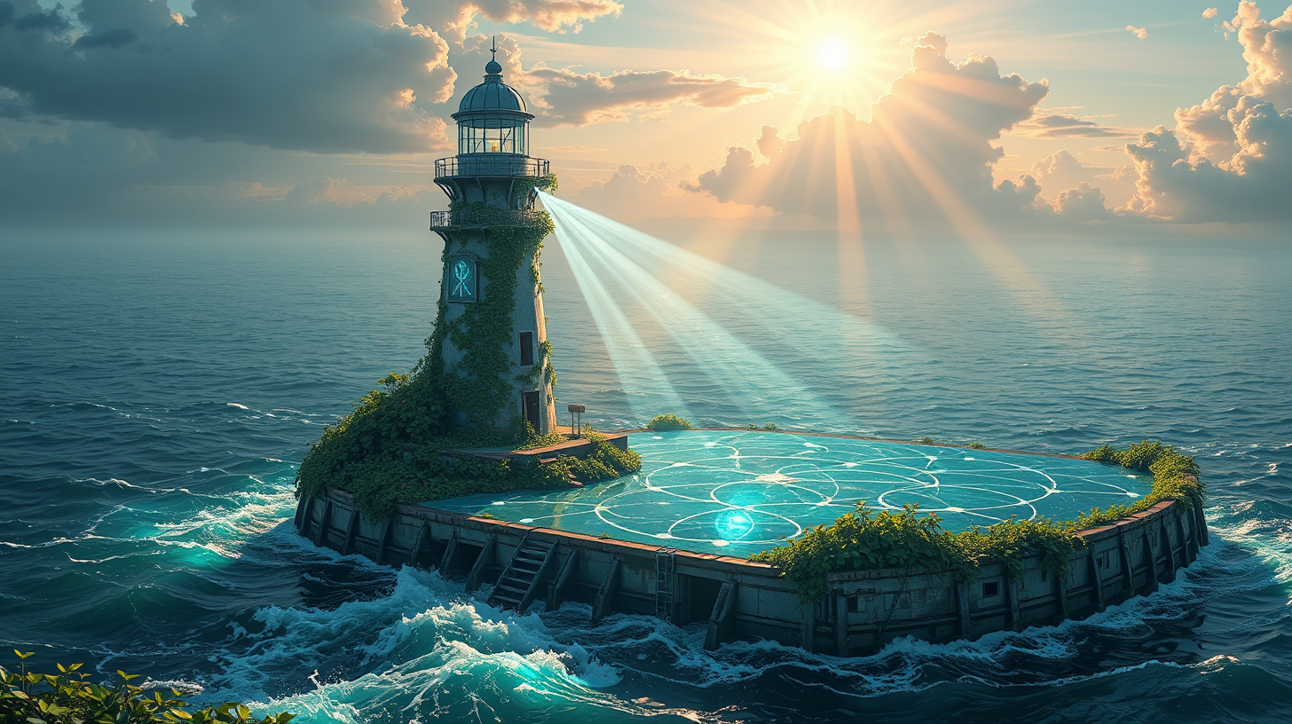 作图提示词:A retrofitted lighthouse composed of weather-aged hulls projects laser-etched lineage diagrams onto river currents, their moiré patterns amplified by floating piezoelectric sensors. Medium-long shot framing shows dawn rays diffracting through dichroic filters, casting spectral geometries across cellulose-reinforced glass platforms. Macro details reveal genetically-modified ivy pulsating through nanofluidic channels in repurposed bulkheads, synchronized to tidal algorithms through submerged piezocrystals.