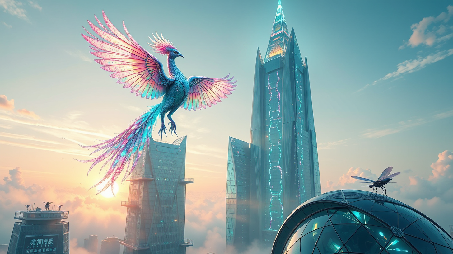 描述:清远鸡基因库上方,半透明羽翼的光子凤凰悬浮。广角镜头下,晨曦透过棱柱摩天楼,岭南建筑元素与参数化设计交融。凤凰翎羽折射七彩光辉,生物发光数据流在悬臂玻璃步道流淌,机械蜻蜓停驻钛合金曲面,翅振在湿气中形成干涉图案。科技神性与东方神秘主义碰撞,凤鸣之韵,是智慧与光影的璀璨共鸣。